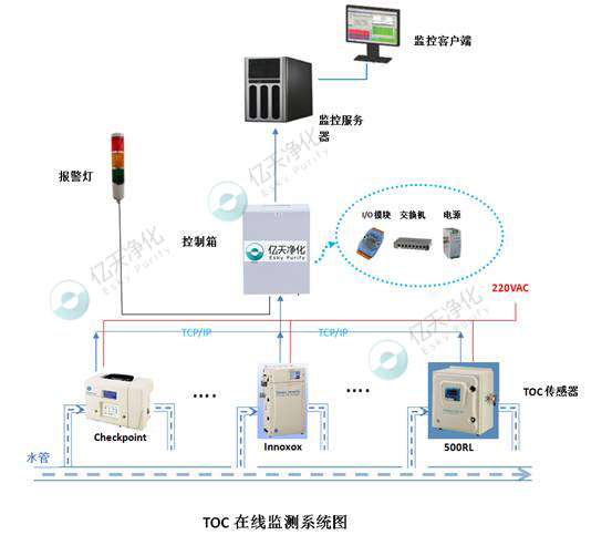 The system is mainly composed of TOC sensors, electric control boxes, servers and monitoring software. CheckPoint TOC sensors collect data, the electric control system transmits data, and the monitoring server is responsible for saving and processing data, so as to achieve the purpose of real-time online data monitoring. It can also provide various auxiliary functions, such as: TOC historical data query, chart generation, operation records, alarm warning, etc., to help users find, analyze and solve problems in time.